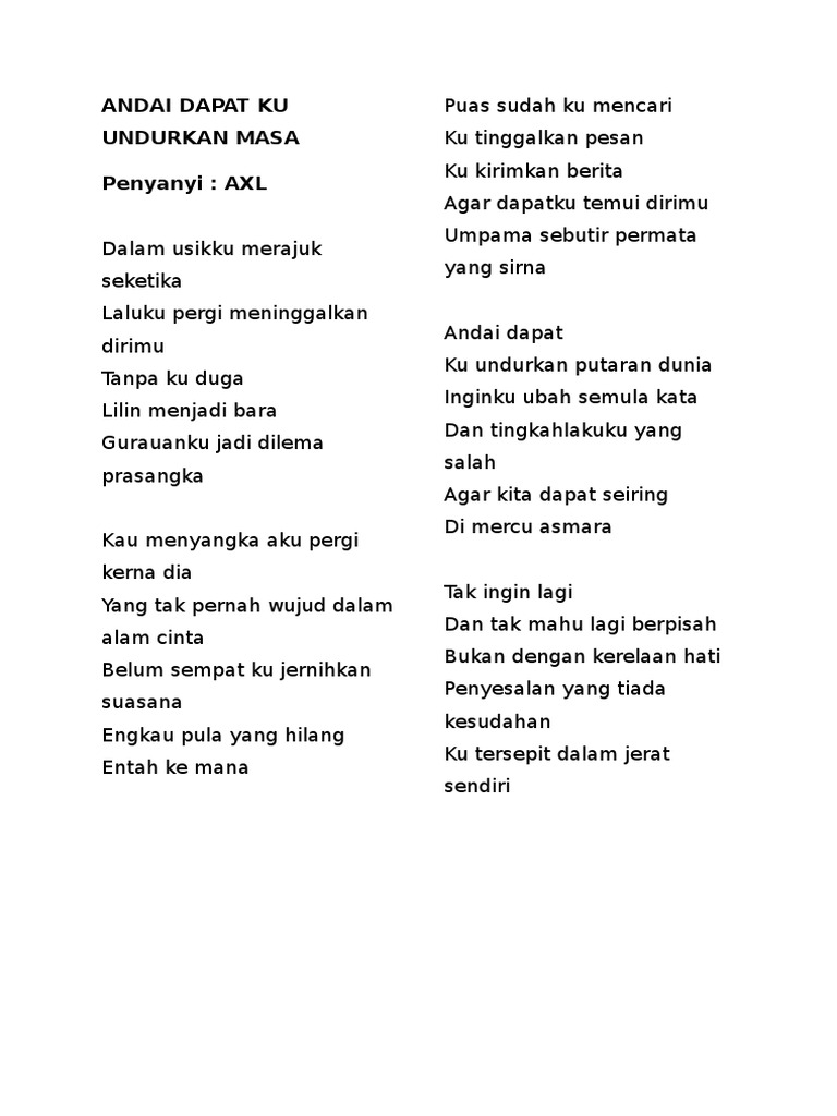 . Liku-liku kehidupan yang dapat aku ulangi sekiranya wujud kesilapan Masa Andai dapat aku undurkan Maka tiadalah lagi erti kematangan Tiada lagi erti pengalaman Tiada lagi erti cabaran dalam kehidupan Masa Andai dapat aku undurkan Kehidupan ini bagaikan sebuah permainan komputer Boleh disave dan boleh diload Bila-bila masa sahaja Kerna itu. Axl - Andai Dapat Ku Undurkan Masa Chord - Malay Gitar Kord Tab Chords Easy Chord Lyrics. Berikut merupakan Lirik Lagu Andai Dapat Ku Undurkan Masa - AXLs.